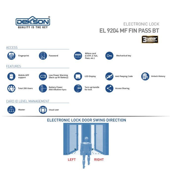 Memberikan kenyamanan serta keamanan untuk Pengguna nya. Dengan kecanggihannya, DEKKSON Smart Digital Electronic Lock EL 9204 memberikan solusi praktis bagi penggunanya karena tidak perlu membuka pintu dengan kunci. Anda dapat menggunakan fingerprint, password, atau E-KTP / E-Toll untuk membuka pintu. Dari segi tampilan, DEKKSON EL 9204 memberikan tampilan mewah bagi rumah Anda.