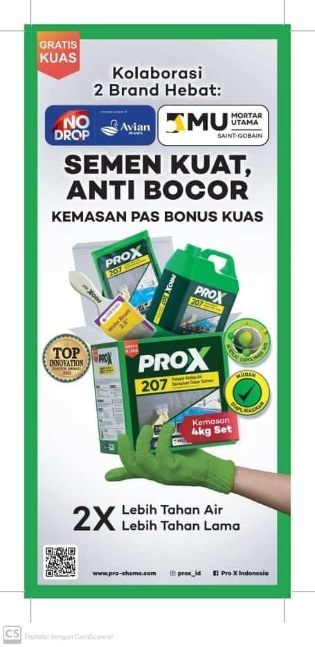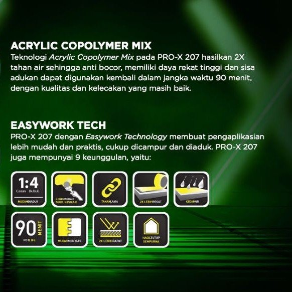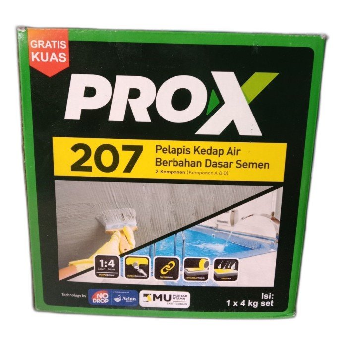 PRO X 207 adalah pelapis kedap air berbahan dasar semen,Fuller,aditif,dan acrylic copolymer yg di formulasi khusus dengan fitur kedap air, dan mudah di aplikasikan, PROX 207 dapat diaplikasikan pada beragam area basah baik exterior maupun interior seperti kamar mandi, dak beton, dan balkon , atau area terendam seperti ground water tank , basement, dan kolam renang .