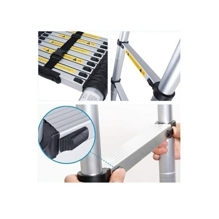 Tangga ini dirancang dengan konsep bersusun sehingga dapat diatur ketinggiannya hingga 2,6 meter.